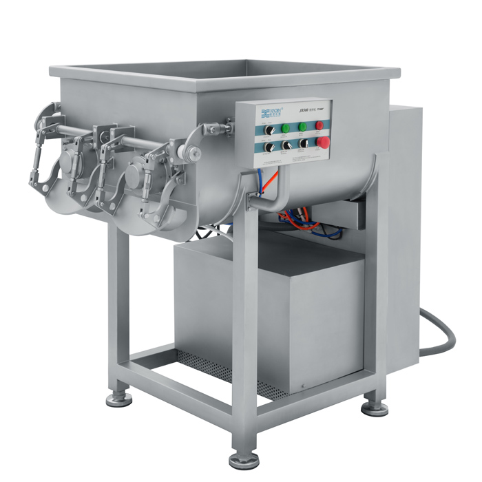 我公司生產的食品攪拌機是參照國際同類產品的特點,同時結合我國肉制品加工工藝特點,自行研制開發而成的新一代產品。是用于混料的必備設備,效率高,便于操作,真正實現了物料攪拌的均勻,膨脹充分,彈性好,色澤鮮艷并較大限度地提取蛋白質多種功能,適合各種工藝要求,是制作風干腸類產品、粒狀、泥狀混合腸類產品、丸類產品的選用設備。