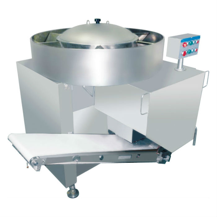 原料裝入喂料盤,由轉子推動在喂料盤內旋轉,當原料轉至切片口時,原料被切成5-7毫米的薄片,隨即這片原料被花刀和喂料輥捕捉,然后送入縱切機構,由圓刀切成寬5毫米的絲,最后送入橫切機構,由梳狀底板和橫切刀將其切成丁。