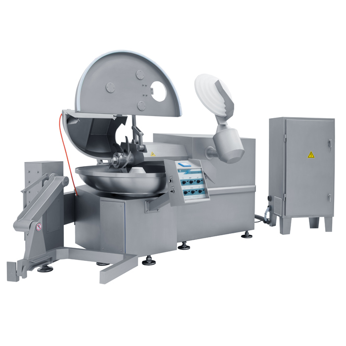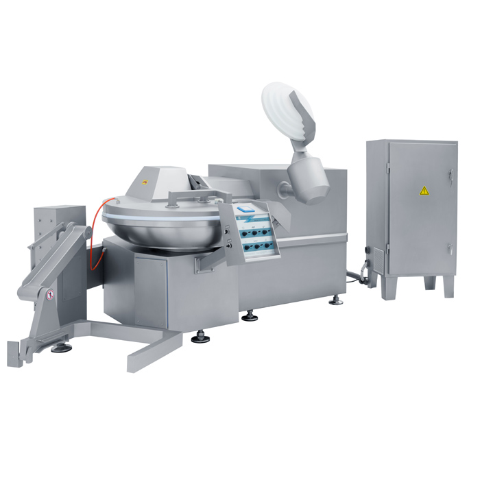 斬鍋由電機(jī)通過減速機(jī)低速旋轉(zhuǎn),不斷向刀組送料。刀軸由雙速電機(jī)(或變頻電機(jī))經(jīng)皮帶帶動(dòng)高速旋轉(zhuǎn)。原料在斬鍋中作螺旋式運(yùn)動(dòng)的同時(shí),被刀組攪拌和切碎并排除肉糜中的空氣,由于切刀的高速斬切,減少了產(chǎn)品的液汁分離率,保證了乳化效果,增強(qiáng)了產(chǎn)品的彈性和細(xì)膩度。